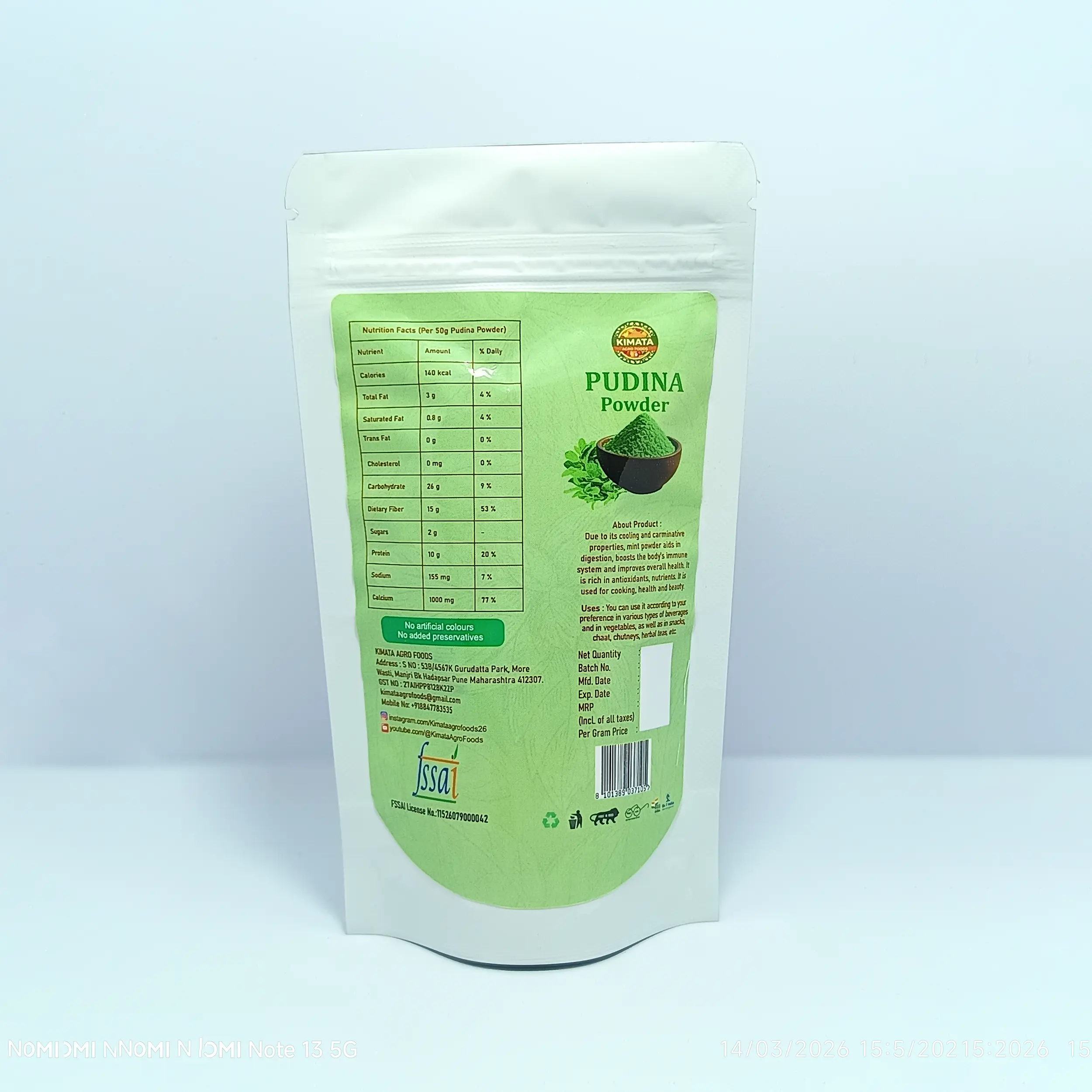 100% Dehydrated Pudina (Mint) Powder with no added preservatives, artificial colors, or flavors.
